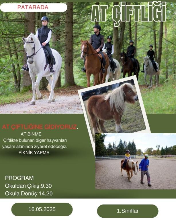 Okulumuz 1.Sınıf öğrencileri AHENK Projesi kapsamında "Doğayı keşfet " teması ile at çiftliğini ziyaret etti. Atlarla doğayı keşfettikten sonra çiftlikte bulunan diğer hayvanları yaşam alanlarında gözlemleyerek ,park alanında vakit geçirdi. Daha sonra piknik yaptılar. Harika bir gün ve deneyim yaşayan çocuklarımız Doğada zaman geçirmenin keyfini çıkardı.